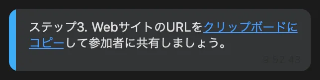 上の画像の青い「クリップボードにコピー」と書かれた部分をクリックすると,立てたルームのURLをクリップボードにコピーすることができます.これをZoomなどのオンライン会議ツールのチャットや授業に関する情報が載っているサイトなどで共有することで,学生にそのルームに入ってもらうことができます.