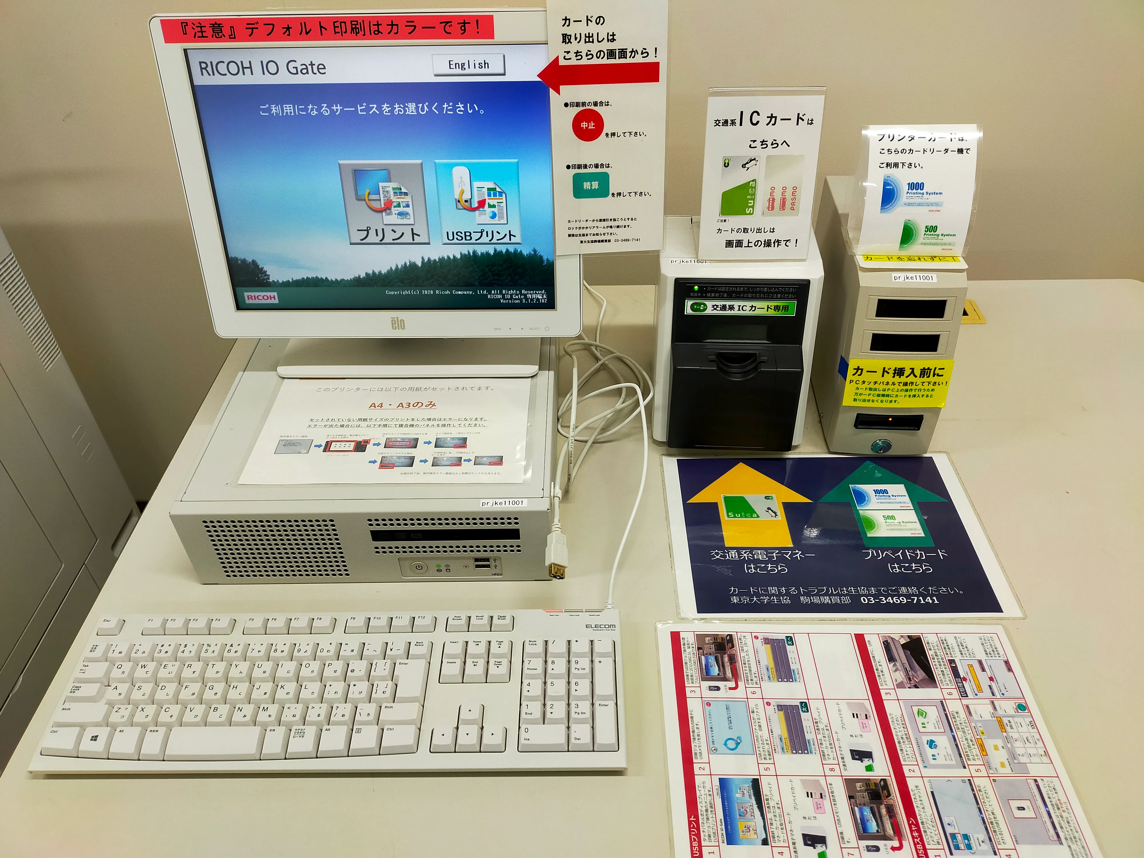 支払いには,ECCS専用のプリペイドカードまたは交通系ICカードが利用できます.プリペイドカードはリコージャパン製のもので,図書館や情報教育棟に設置されている自動販売機や,東大生協の購買部で購入できます.交通系ICカードは,Suica,PASMO,Kitaca,TOICA,ICOCA,SUGOCA,nimoca,はやかけんが利用できます(2020年4月1日現在).モバイルSuica・モバイルPASMOやPiTaPaは利用できません.また,プリペイドカードや交通系ICカードは,複数枚同時に利用できません.