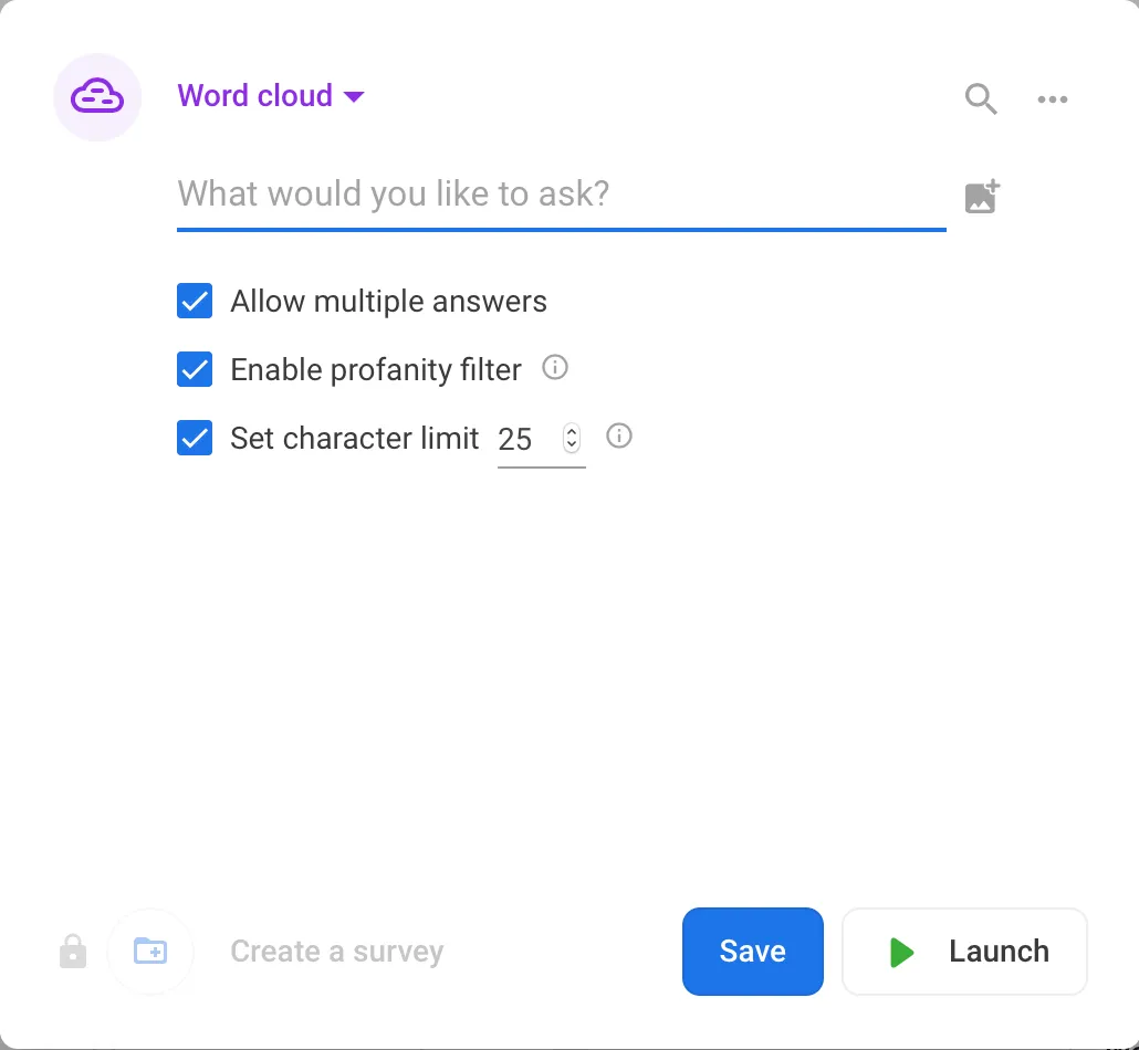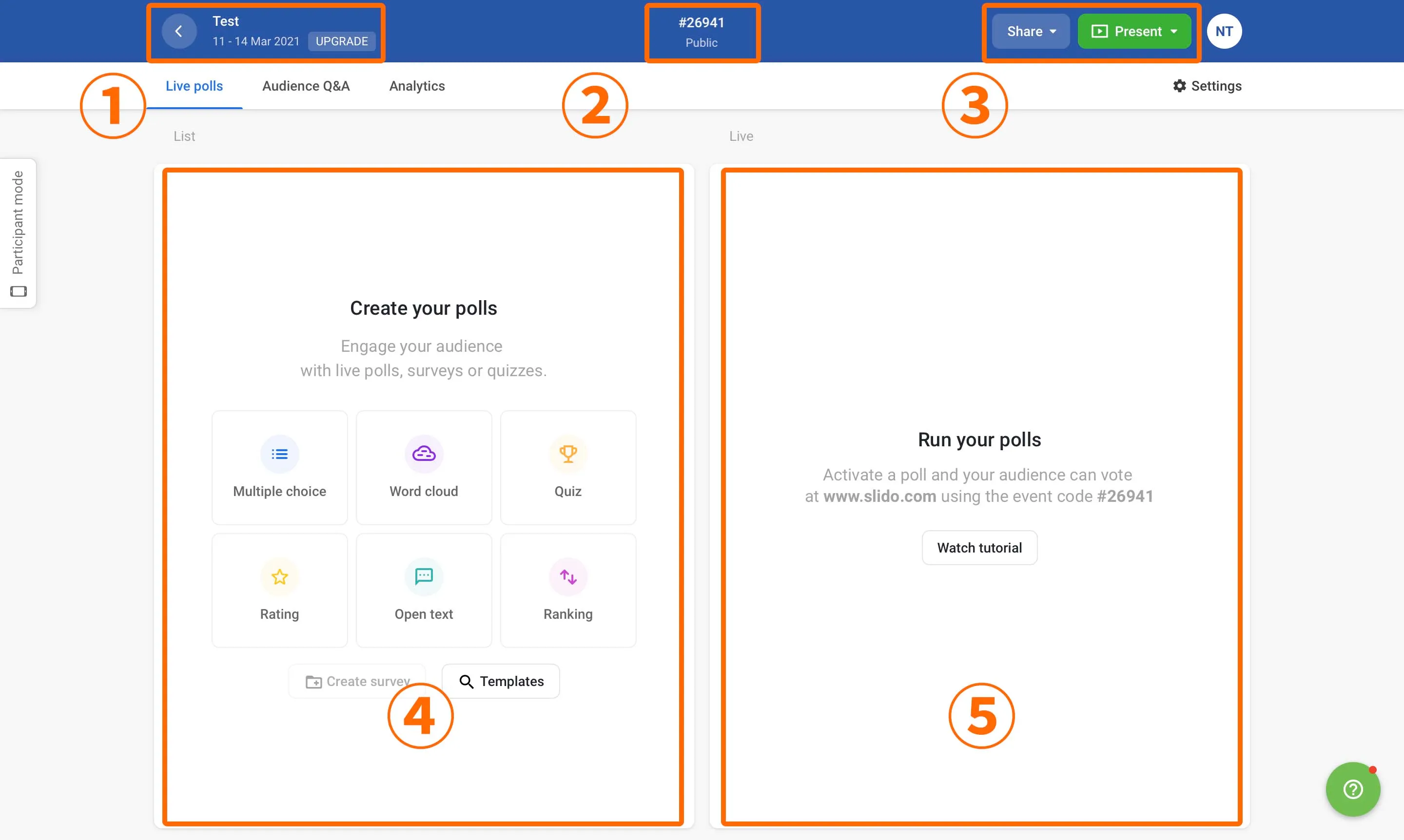 In Slido, the polls feature allows teachers to ask questions/quizzes to students. Select “Live polls” in the upper left corner of the screen.