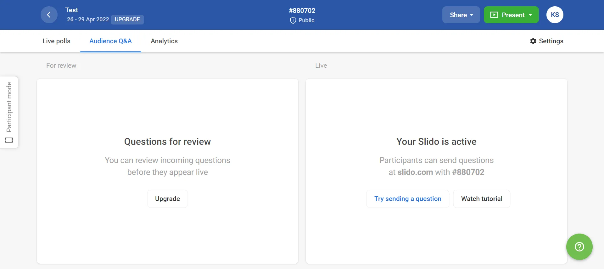 In Slido, students can send questions and comments. Please select “Audience Q&A”” in the upper left corner of the screen. The questions and comments from students will be displayed in the “Live” column on the right side of the screen.
