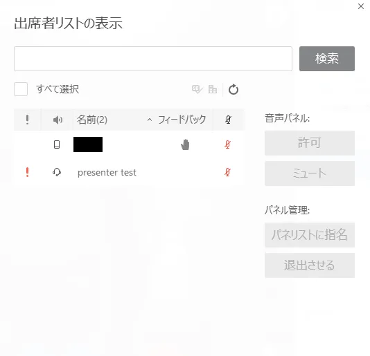 • Microphone icon: A red microphone icon indicates that the participant’s microphone is muted. The host can also mute participants’ microphones. In the figure above, the microphone of a test attendee is muted.