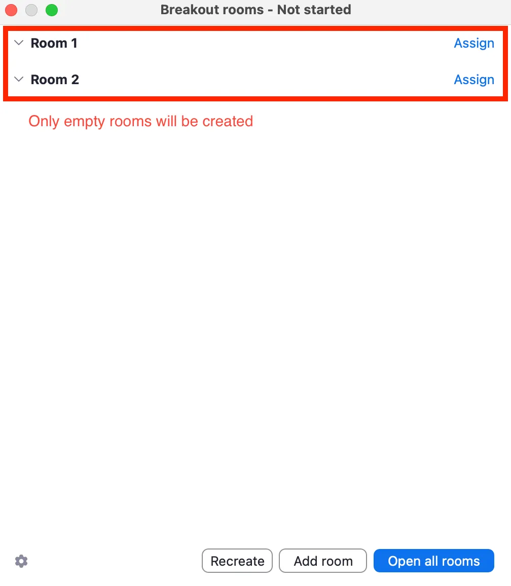 For assigned breakout rooms, you can rename or delete rooms, add new empty rooms, or recreate all rooms from scratch.