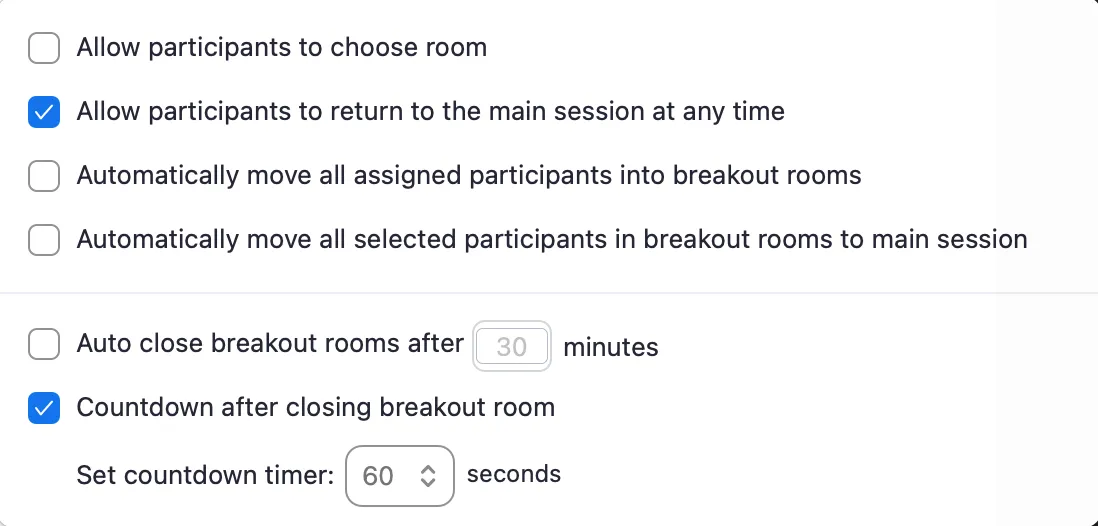 By turning on the “Countdown after closing breakout room” and entering a time, you can create a grace period between the end time and when the breakout rooms actually close. This can be used, for example, as time to summarize opinions in group work.