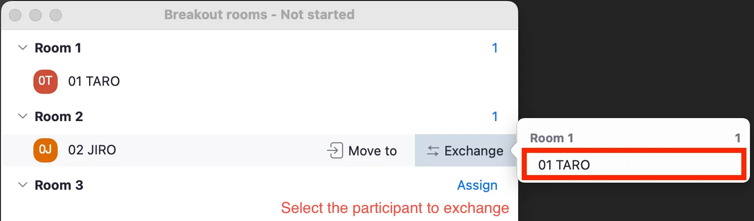 You can move a participant to another room or exchange them with another participant. Hover over the target participant’s name, and “Move to” and “Exchange” will appear. Click one of them and select the destination or the person to swap with to execute the move or exchange.