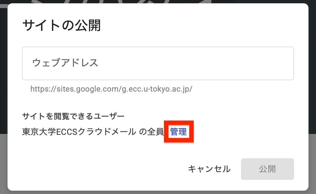 • 「東京大学ECCSクラウドメール」を選択した場合,ECCSクラウドメールのユーザーだけが閲覧できるようになります.大学構成員に公開範囲を限定したいときは,「東京大学ECCSクラウドメール」を選択してください.