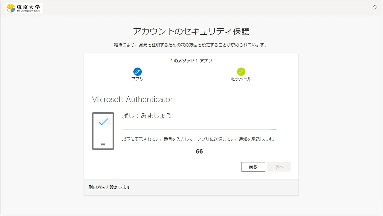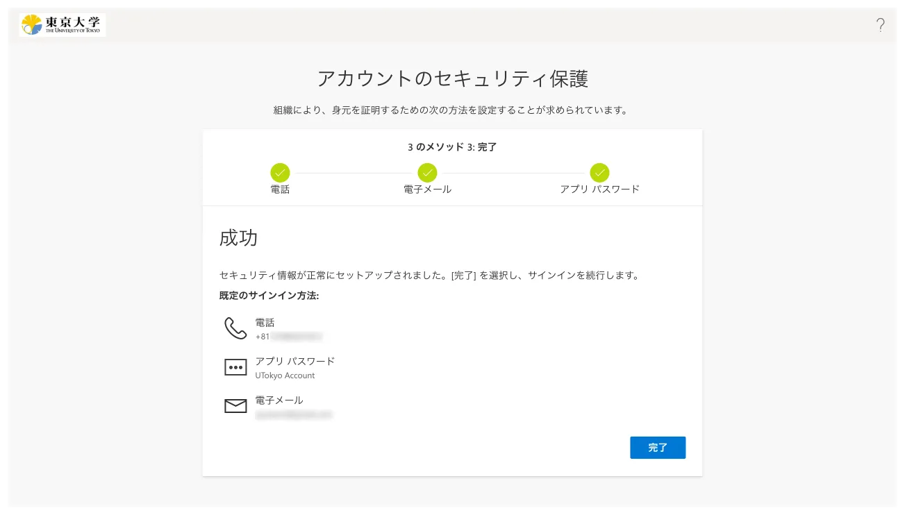 手順を終えると,その後UTokyo Accountにサインインする際,毎回,設定したSMSや専用のアプリなどで本人確認することが求められます.登録した本人確認方法(スマホのアプリや電話番号)が利用できない状態ではUTokyo Accountにサインインすることができなくなりますので,十分ご注意ください.