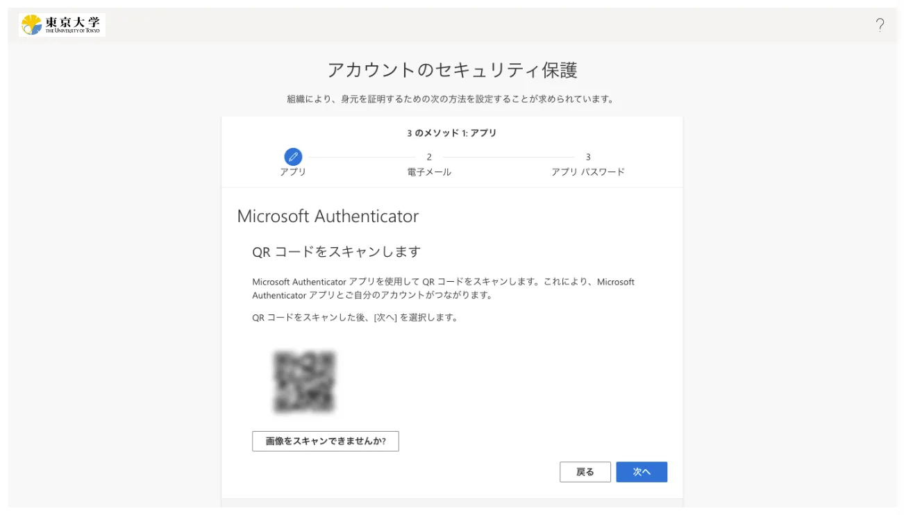 画面の指示に従って進むとQRコードが表示されるので,お使いの認証アプリでQRコードを読み取り,設定を行ってください.