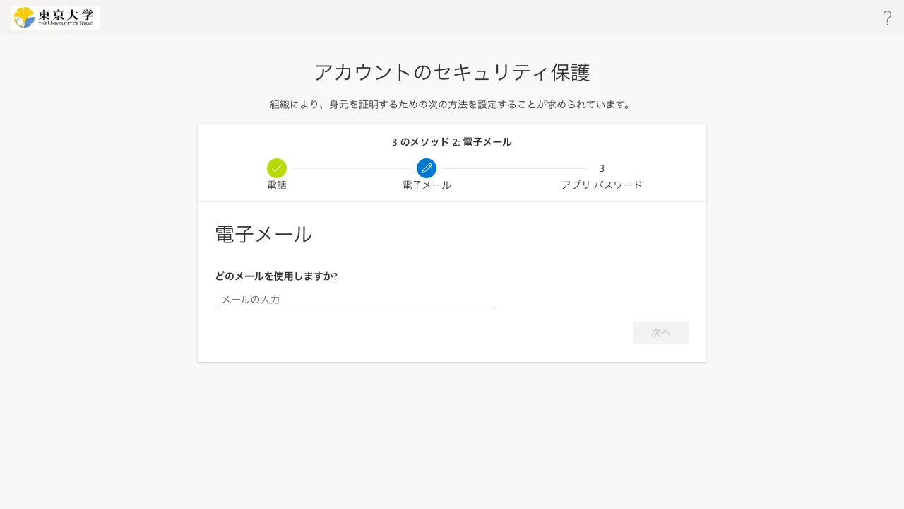 @utac.u-tokyo.ac.jp)とパスワードを入力してください. - 「詳細情報が必要」という画面が表示されるので,「次へ」を押してください.