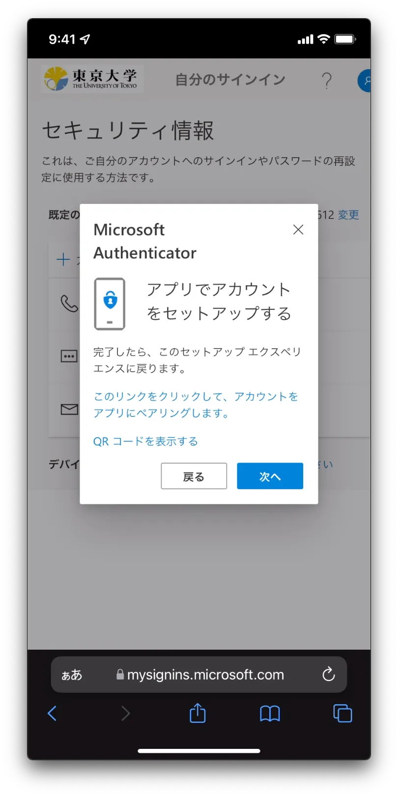 - 「セキュリティ情報」と書かれた多要素認証の設定ページが表示されればOKです.