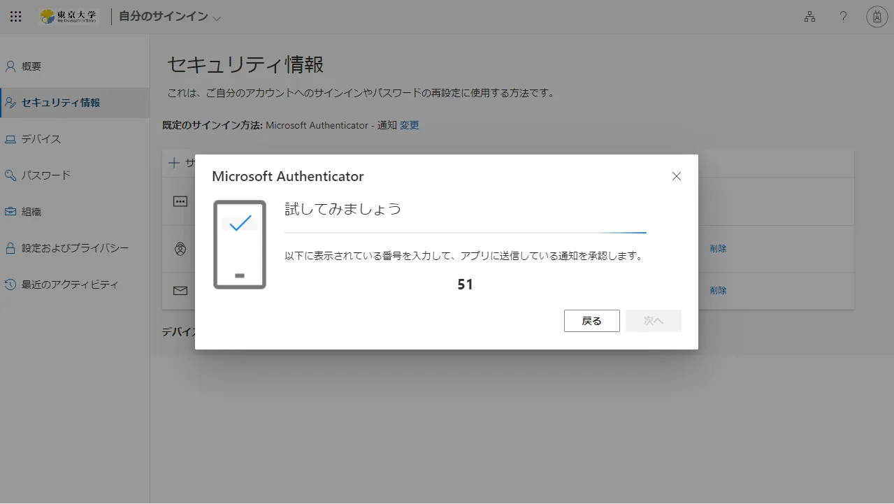 - Microsoft Authenticatorの場合:スマホに通知が送られ,サインイン画面に表示されている2桁の数字を入力するように求められるので,そのようにしてください.