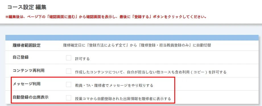 • 「教員・TA・履修者でメッセージをやり取りする」をオンにするとメッセージ機能が有効化されます.