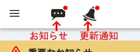 未読のお知らせ・更新通知があると,画面上部のバーに表示されるアイコンに赤い丸が付きます.アイコンを押すとボックスが開き,未読の通知が表示されます.